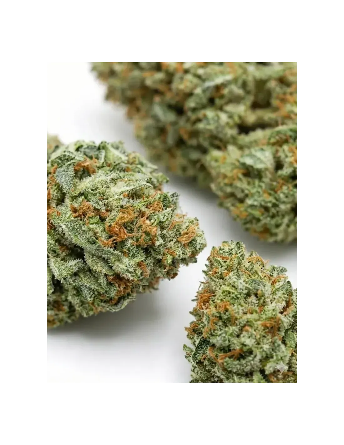 La Zkittlez THCX est célèbre pour son profil terpénique unique qui rappelle les bonbons aux fruits. Ses fleurs denses et vert clair sont parsemées de pistils ambrés, témoignant d'une culture indoor d'exception.